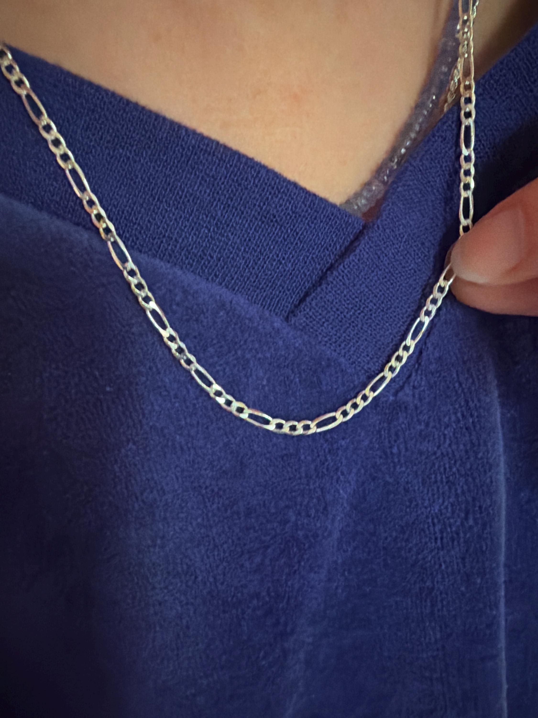 Excellent quality figaro chain. Sparkly and smooth. I will return to this store when I need silver chains. Very fast shipping! Thanks!
